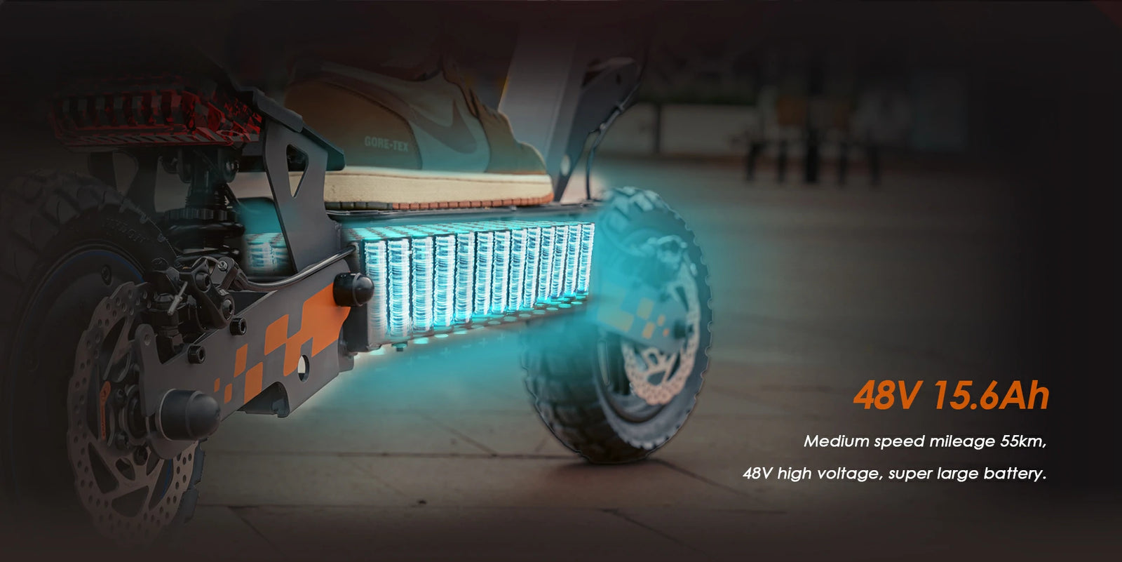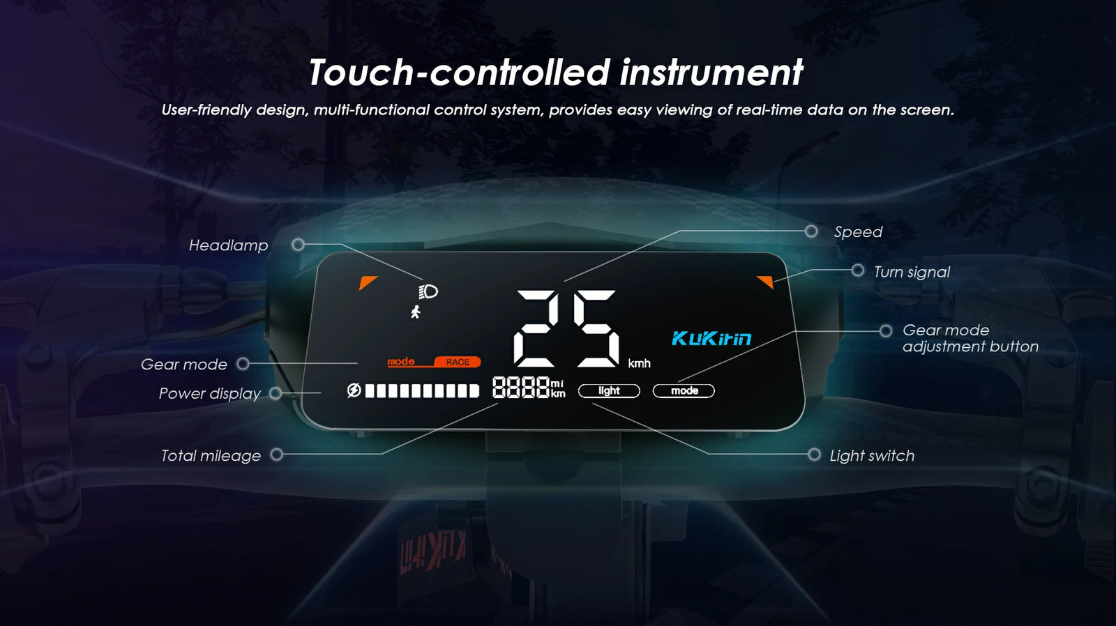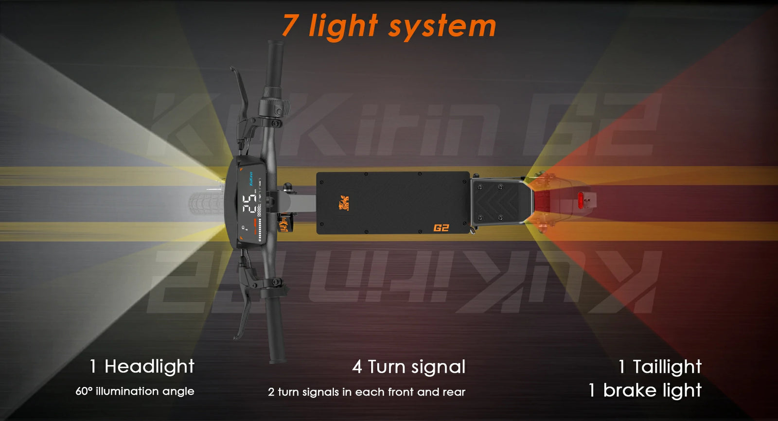 The KuKirin G2 VMP is equipped with 10-inch off-road vacuum tires and front and rear spring dampers, whose excellent grip and shock absorption ensure a smooth ride in all road conditions. The design of the vacuum tires reduces the risk of flat tires and increases driving safety and comfort. Whether it's on city tarmac or gravel trails in the countryside, the KuKirin G2 can handle it with ease, providing you with an unparalleled riding experience.