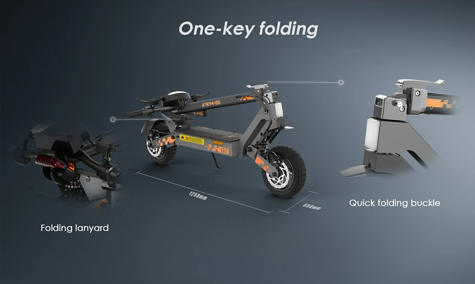 The KuKirin G2 VMP is designed with a one-touch folding mechanism, which allows you to fold and unfold the riser in just a few simple steps. After folding, the strap on the front of the bike can be attached to the bottom plate where the tail light is located to lock the frame securely and avoid accidental unfolding during transportation, thus ensuring the safety and stability of users when carrying the bike. The compact folding device has been rigorously tested and is not easily loosened even after frequent folding, providing users with a long-lasting and convenient experience.