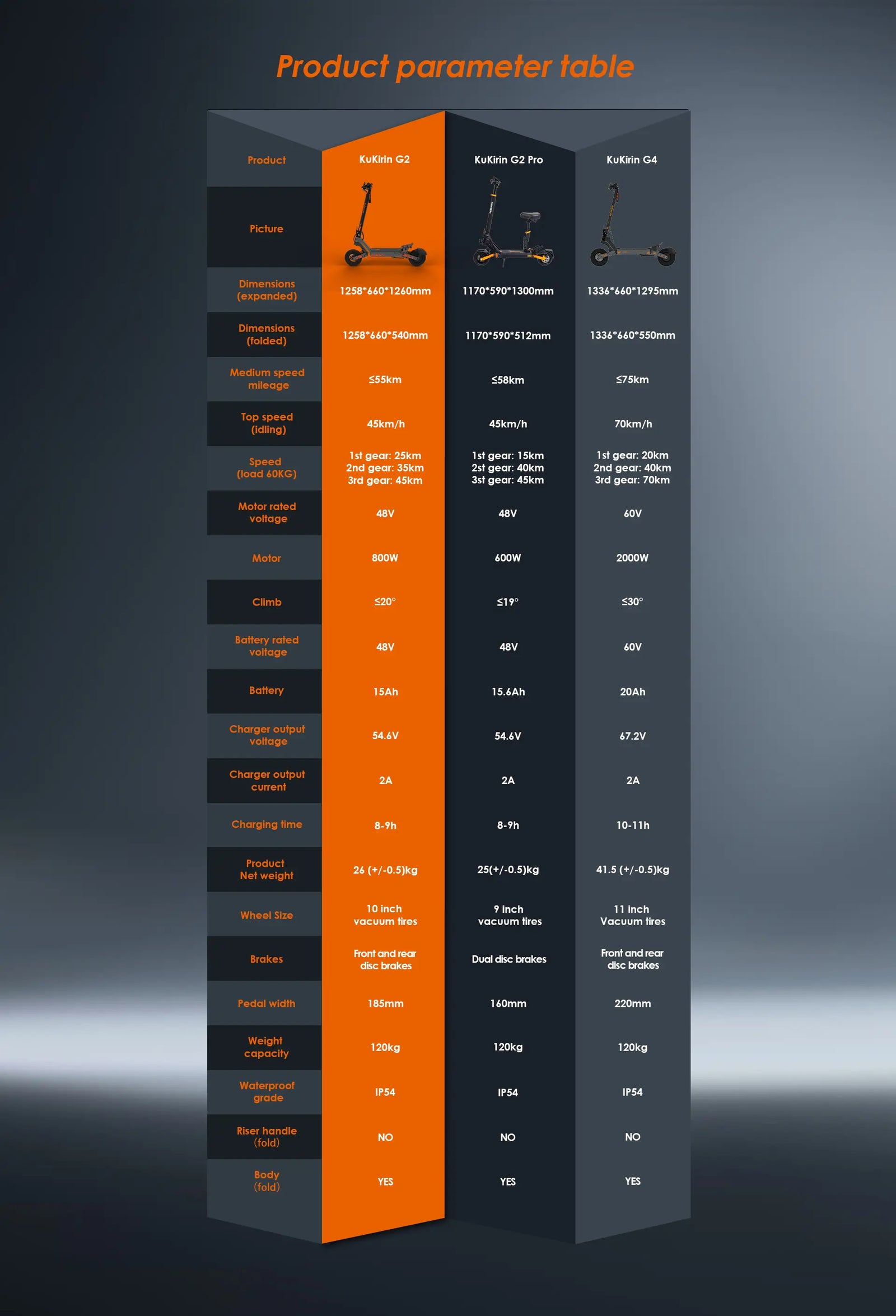 KuKirin G2 ottimizza il materiale e il design strutturale sulla base della garanzia della resistenza e della stabilità del corpo, mantenendo il peso netto del prodotto a circa 26 kg. Il prodotto è facile da trasportare e riporre, con un formato pieghevole compatto, molto comodo per andare e tornare dal lavoro o per metterlo nel bagagliaio di un'auto.
