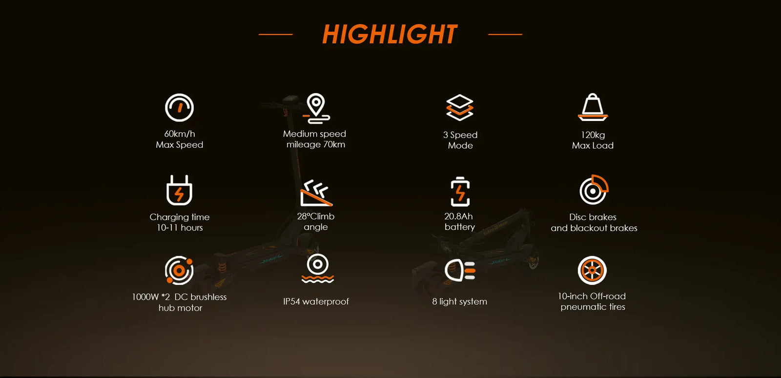 Pneumatico10 polliciLuciLED integratoFreniFreno a disco anteriore e posterioreAmmortizzatoreAmmortizzatore idraulico