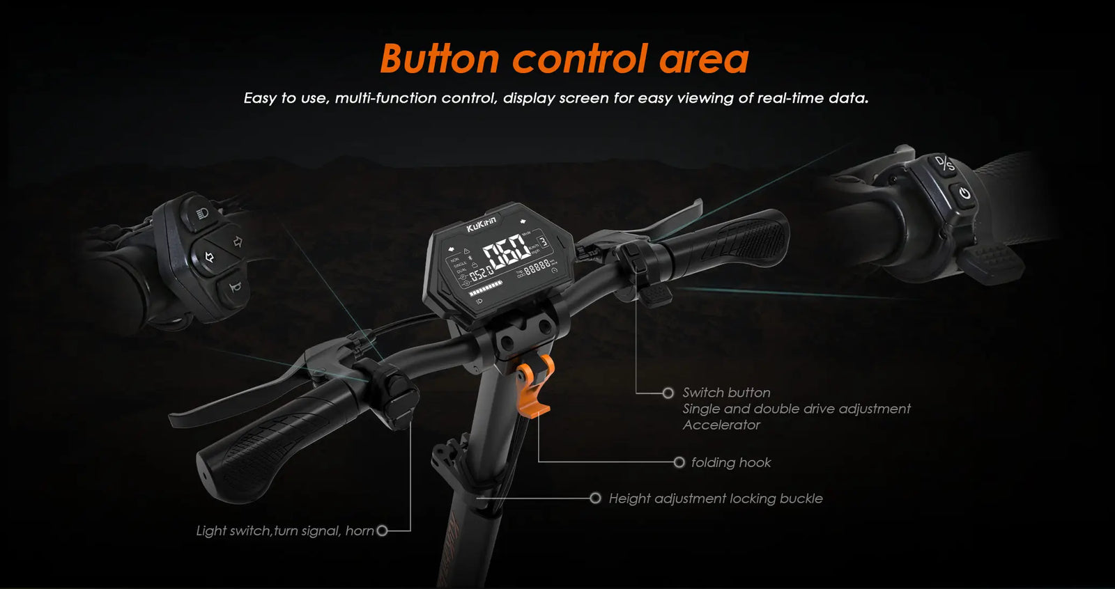 Il display ultra-ampio ad alta definizione del KuKirin G2 Master fornisce una visualizzazione di immagini e testo più dettagliata, consentendo al conducente di visualizzare varie informazioni sullo scooter e l'interfaccia operativa in modo più chiaro. Il conducente può controllare la velocità e la direzione di guida dello scooter elettrico tramite un semplice funzionamento, facile da usare e divertente da guidare, offrendo al cliente un'esperienza di guida migliore.