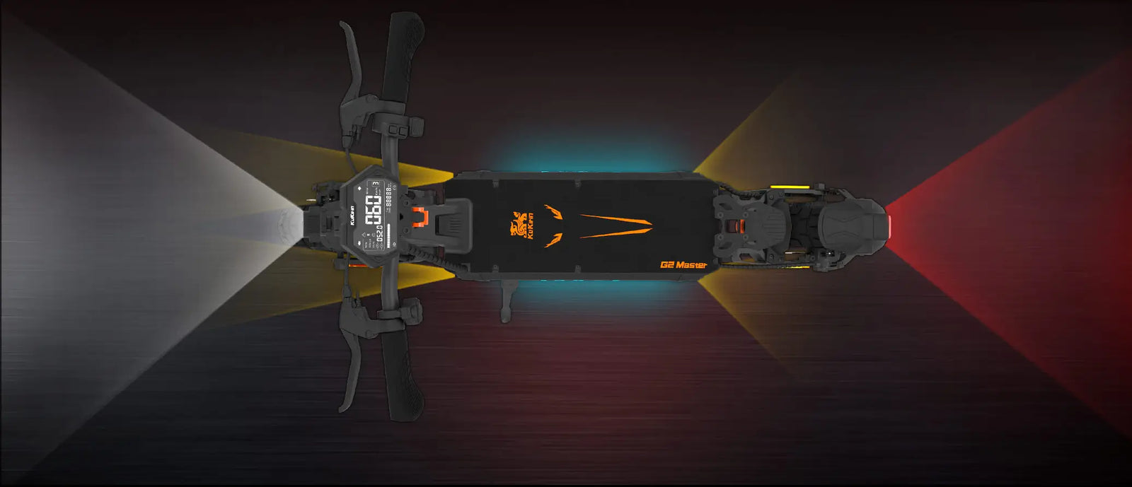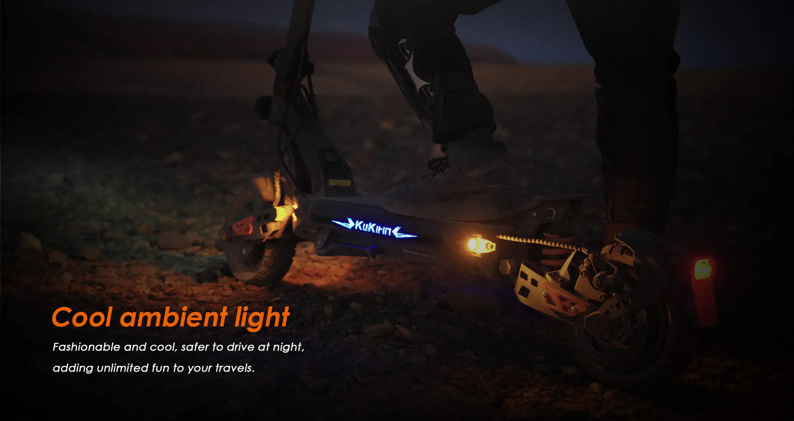 Il design con 8 luci ambientali KuKirin G2 Master non solo cambia colore all'avvio dello scooter, aumentando il divertimento e la giocabilità della guida per i gruppi di utenti giovani e alla moda, ma rende anche il veicolo più visibile durante la guida notturna, garantendo così la sicurezza della guida notturna.