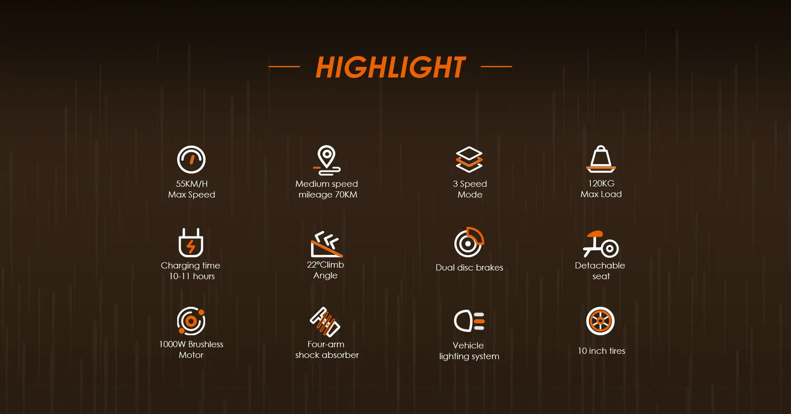 Pneumatico10 polliciLuciLED integratoFreniFreno a disco anteriore e posteriore e freno elettricoAmmortizzatoreAssorbimento degli urti a molla