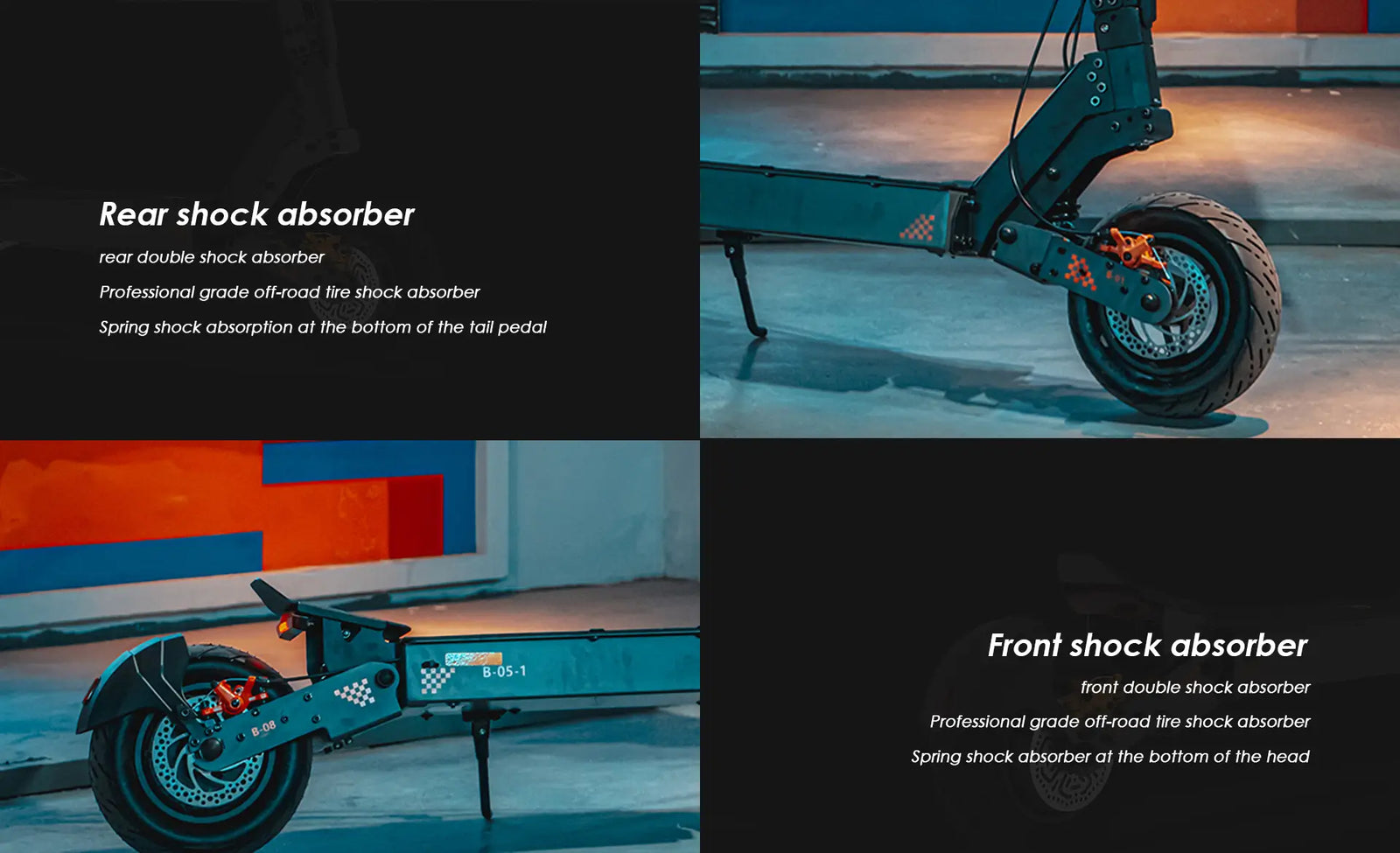 Pneumatico11 polliciLuciLED integratoFreniFreno a disco anteriore e posteriore e freno elettricoAmmortizzatoreAssorbimento degli urti a molla