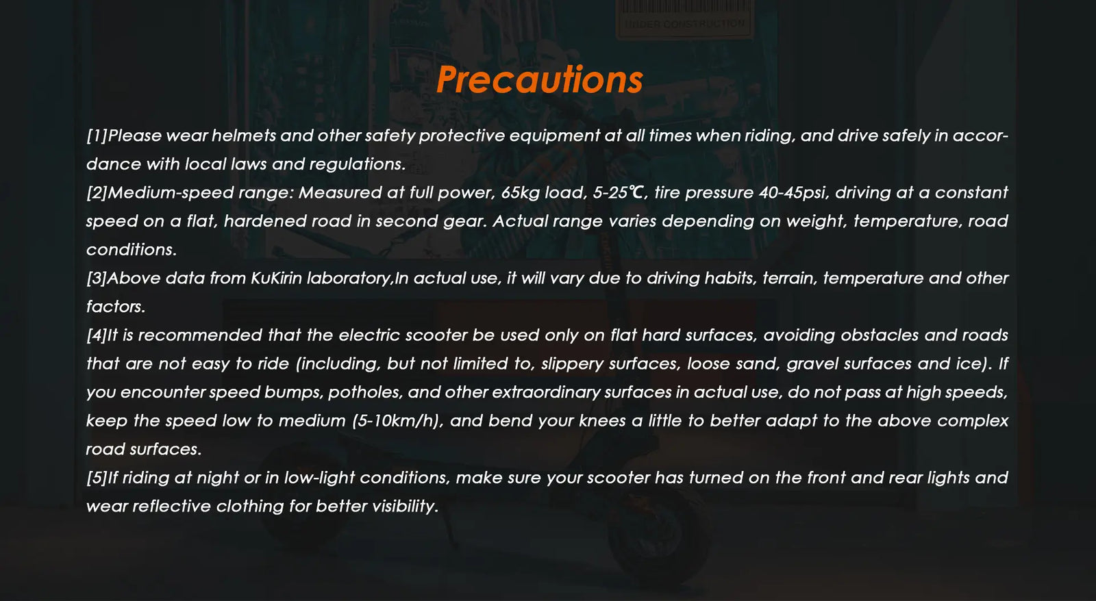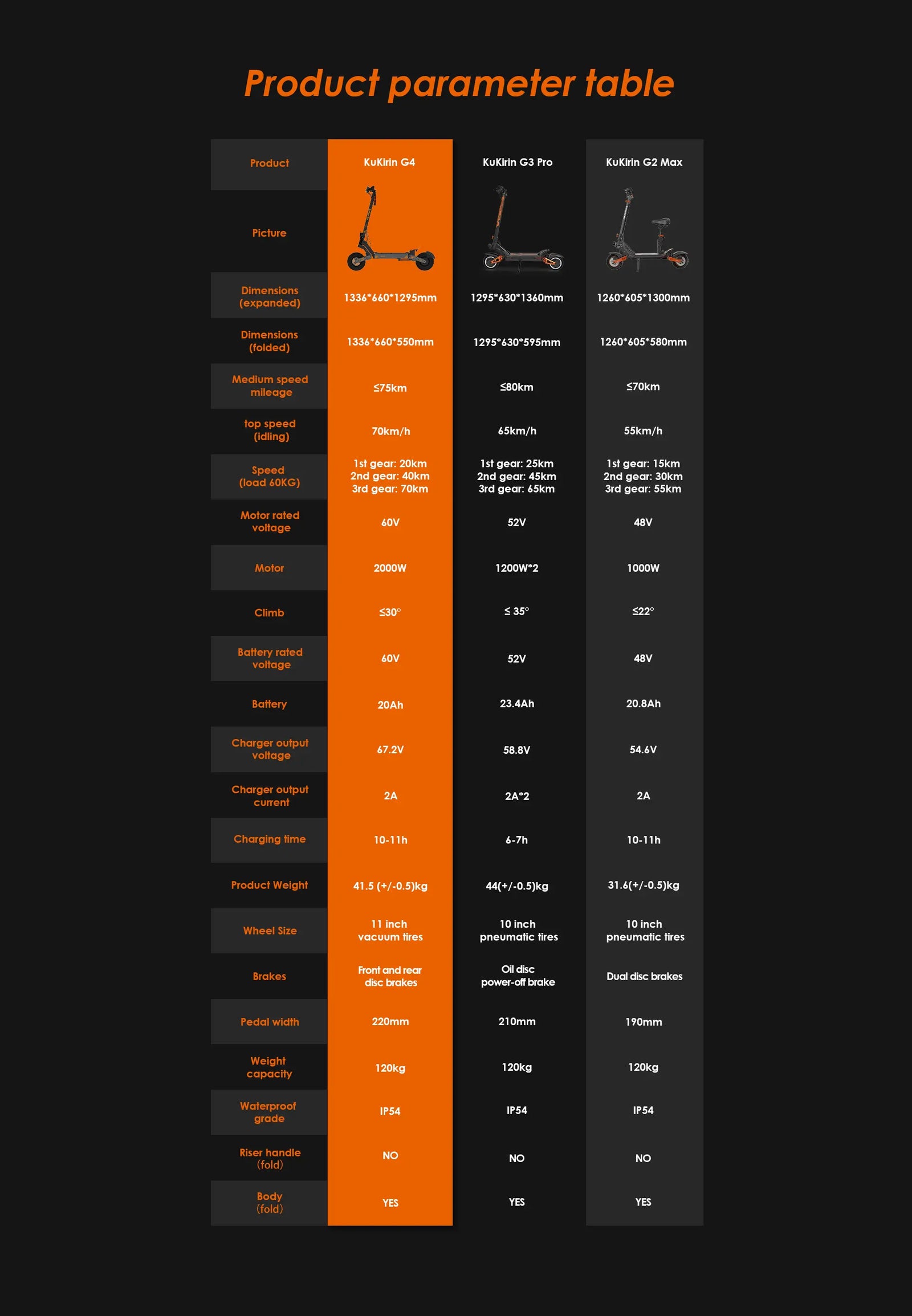 KuKirin G4 adotta materiali misti acciaio-alluminio ad alta resistenza, assali anteriori pressofusi, design integrato, parti pieghevoli forgiate ad alta resistenza e tutti i connettori sono fissati con bulloni in acciaio inossidabile; il corpo stabile e robusto garantisce la potenza di uscita continua ad alta velocità dello scooter.